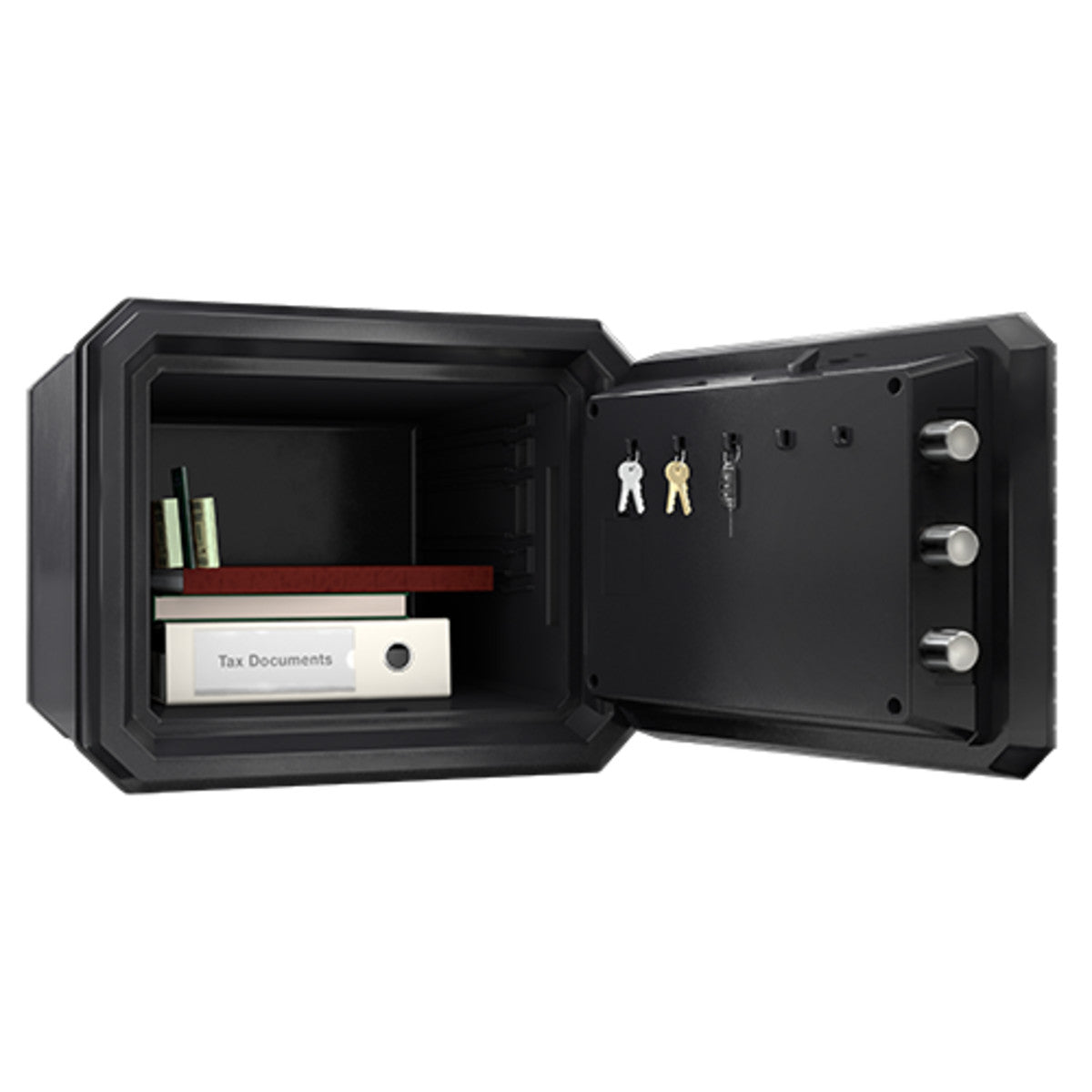Inside the document safe, you’ll find thoughtful details that make a difference — a metal handle for easy opening, steel bolts that click audibly when locked, and internal lighting to help you find what you need quickly. It runs on long-lasting CR123 lithium batteries and includes an After-Fire Replacement Program to help you recover and continue protecting what matters most.